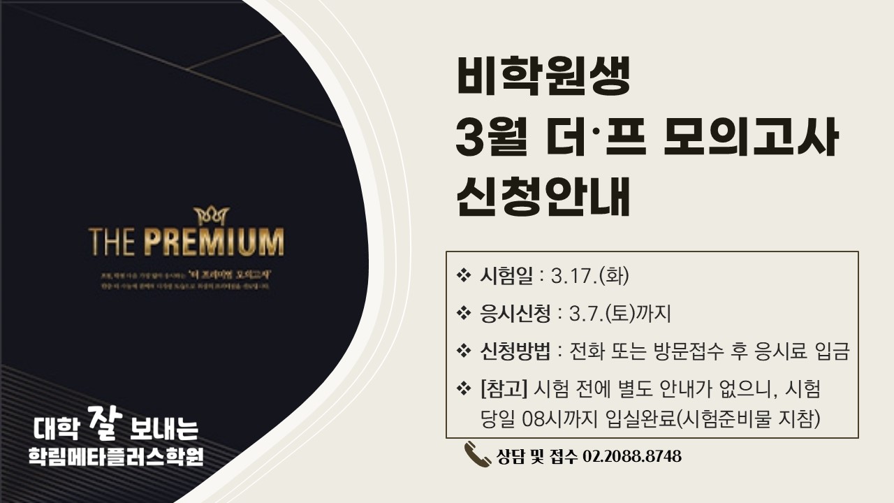 공지사항 HOME > 공지사항 > 공지사항 [비학원생] 3월 더프모의고사 신청안내 작성자 : 학림메타플러스학원() 작성일 : 2026-02-22 조회수 : 52 파일첨부 : 이전글 다음글 [2027대입] 2026년 평가모의고사 일정 리스트