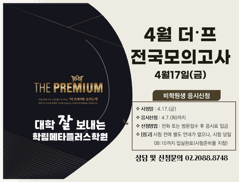 공지사항 HOME > 공지사항 > 공지사항 [비학원생] 4월 더프모의고사 신청안내 작성자 : 학림메타플러스학원() 작성일 : 2026-03-23 조회수 : 26 파일첨부 : 이전글 다음글 [비학원생] 3월 더프모의고사 신청안내 리스트