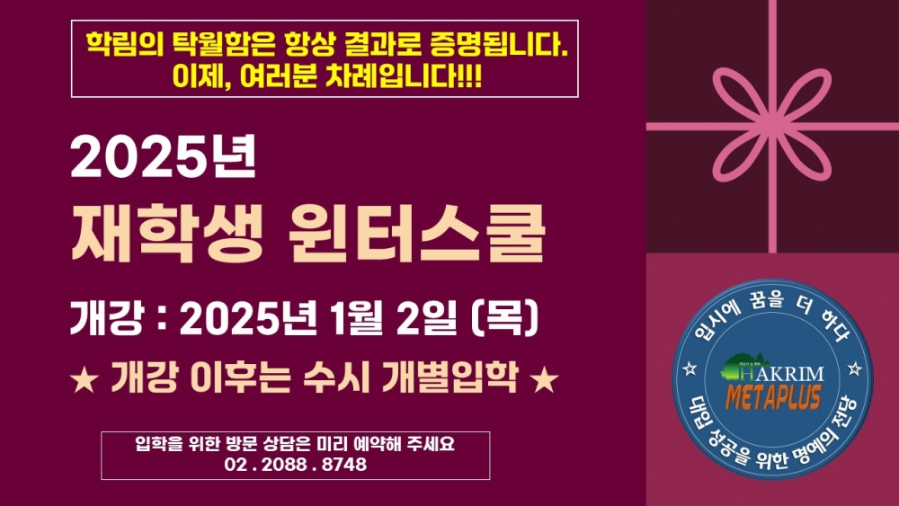 추운 겨울방학 기간동안 빡세게 공부할 학생만 모집합니다. 학습관리형 윈터스쿨로서 입시교육과 학생부 관리요령 그리고 수능대비 학습법등 다양한 학림메타 입시컨텐츠를 통해 대입성공의 터닝포인트로 활용하시기 바랍니다.