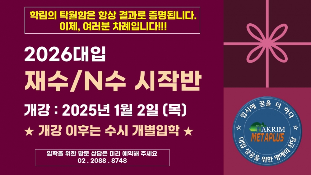 치열했던 2025대입전형이 아직 진행중입니다. 하지만, 더 높은곳을 향해 남들 보다 일찍 2026대입을 준비하려는 열정과 강한 의지를 가진 수험생을 모집합니다.