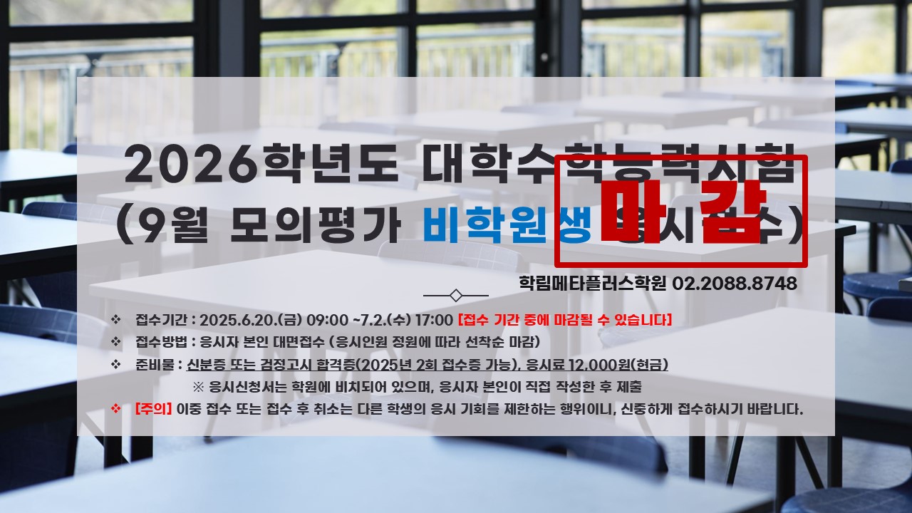 공지사항 HOME > 공지사항 > 공지사항 9월모평 비학원생 응시신청 [마감] 작성자 : 학림메타플러스학원() 작성일 : 2025-06-18 조회수 : 609 파일첨부 : 이전글 2026학년도 수능 원서접수 다음글 반수반 모집 리스트