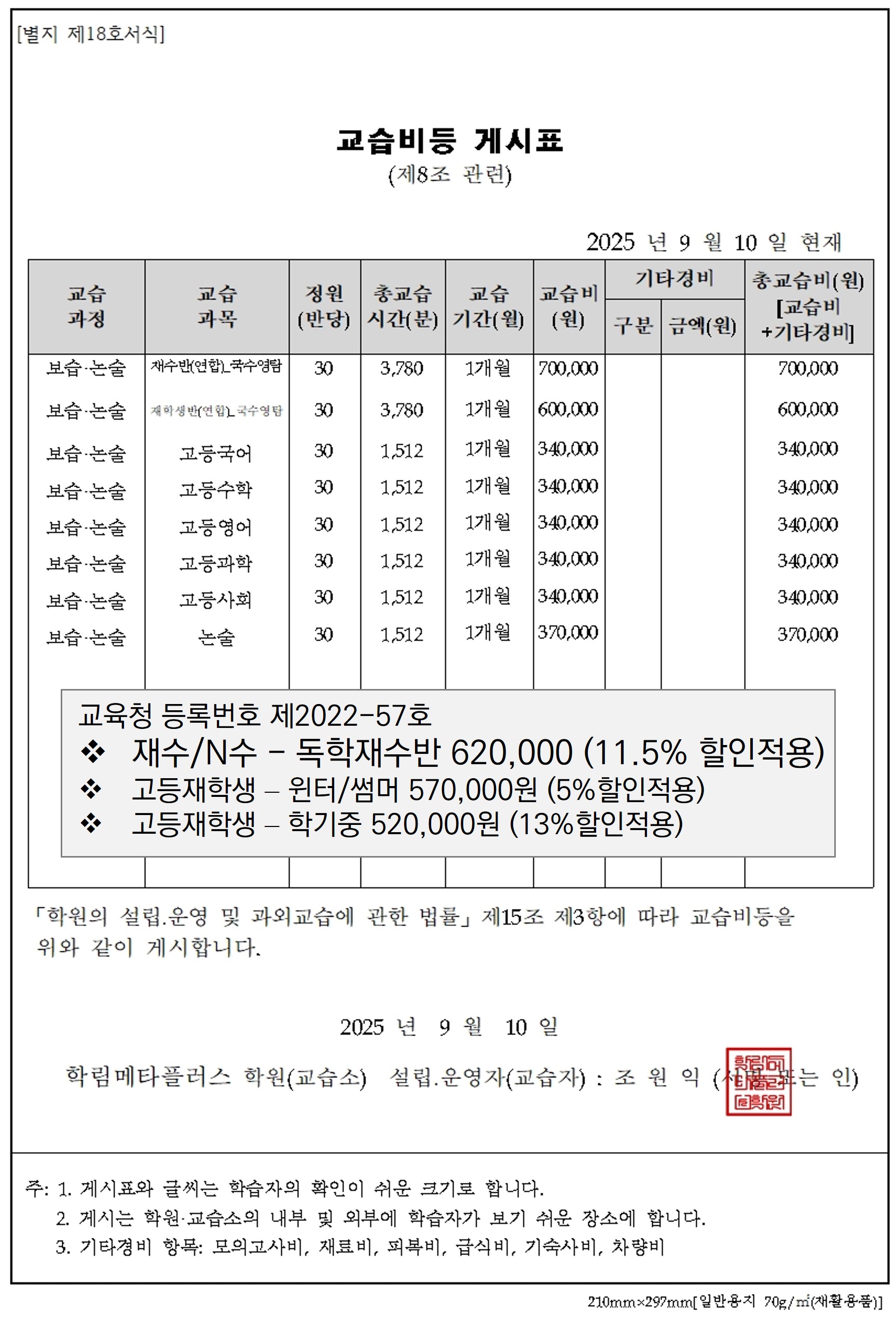 공지사항 HOME > 공지사항 > 공지사항 2026년 교습비안내 작성자 : 학림메타플러스학원() 작성일 : 2025-10-22 조회수 : 172 파일첨부 : 이전글 2026수능 수험생 유의사항 다음글 [2026수능] 최종파이널 학습전략 리스트