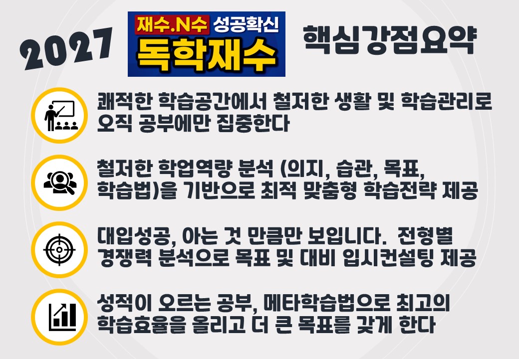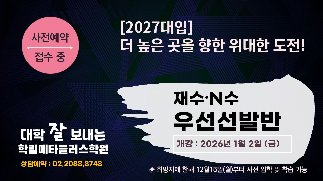 공지사항 HOME > 공지사항 > 공지사항 [2027대입] 재수/N수 우선선발반 모집 작성자 : 학림메타플러스학원() 작성일 : 2025-11-04 조회수 : 331 파일첨부 : 이전글 [2027대입] 책임지겠습니다 다음글 [대입실적] 합격을 축하합니다! 리스트